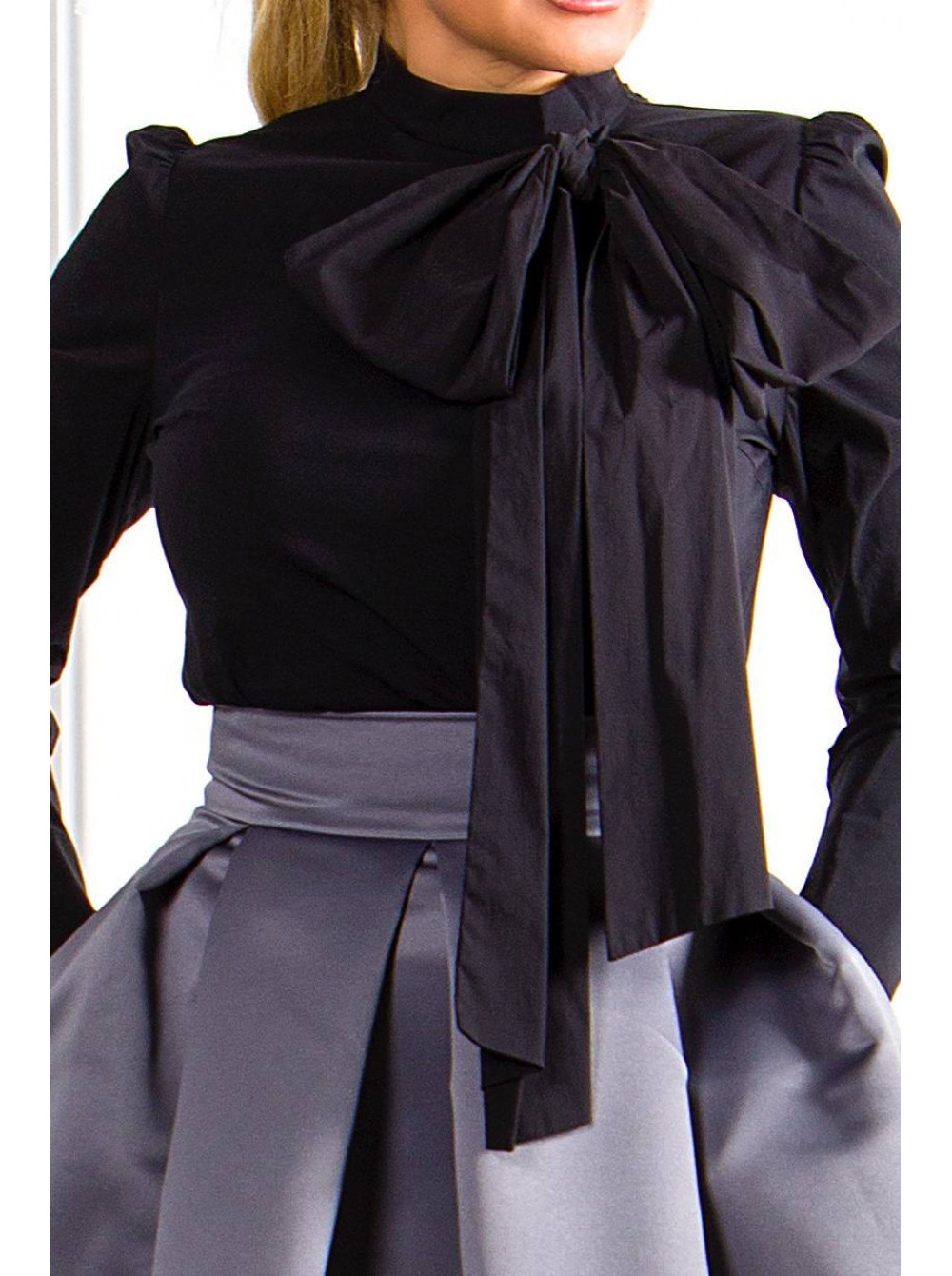 Большой бантик на воротнике — главная изюминка блузки. Он придаёт образу романтичности, игривости и женственности.