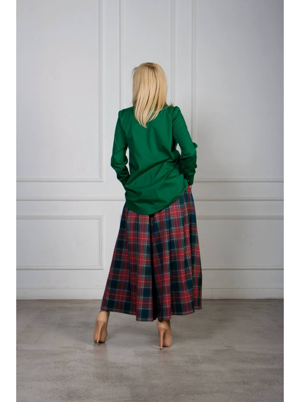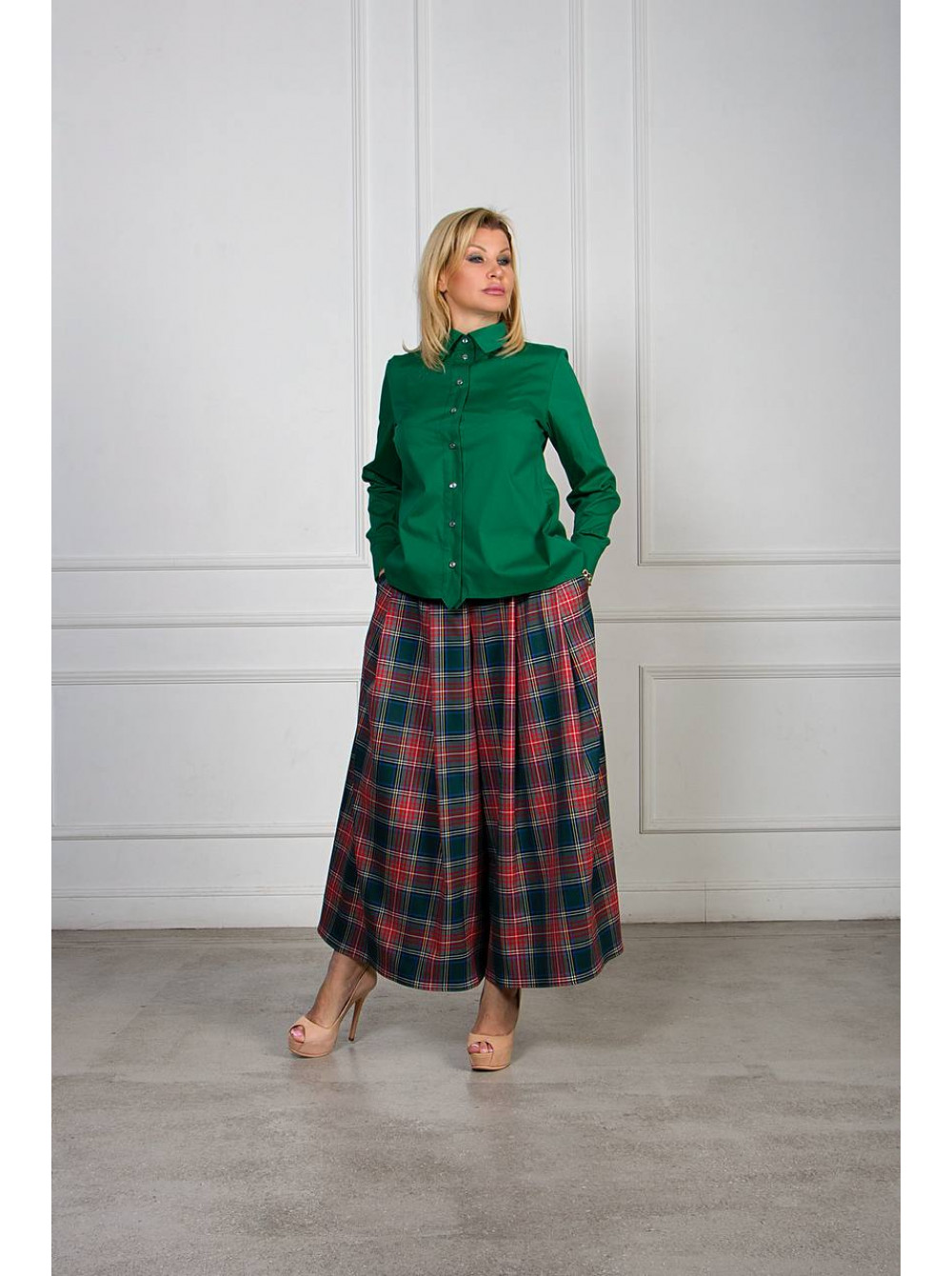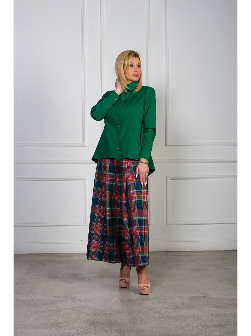 Особое внимание заслуживает сочетаемость: юбка-брюки прекрасно дополняет однотонные блузки, рубашки и жакеты — особенно в нейтральных тонах (бежевом, черном, кремовом) или в цветах, повторяющих акценты клетки. На фото — гармоничный ансамбль с изумрудной хлопковой рубашкой, подчеркивающий глубину и насыщенность принта.