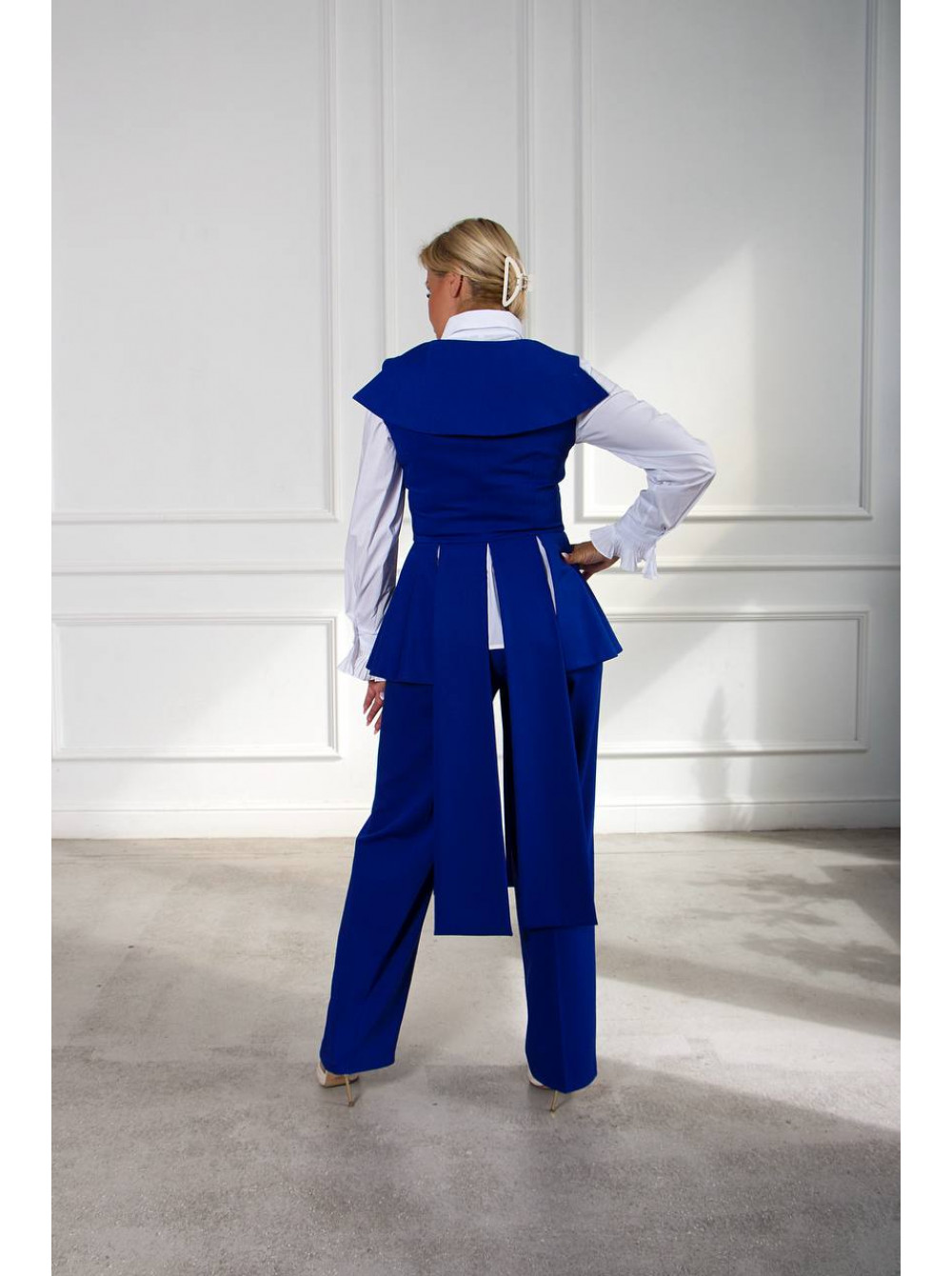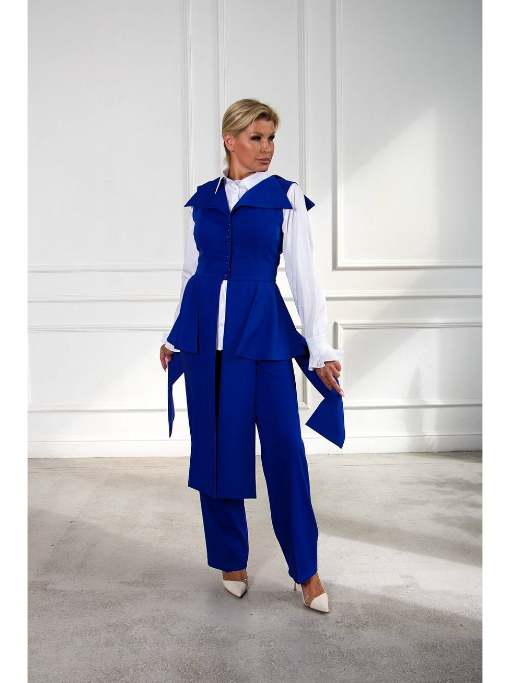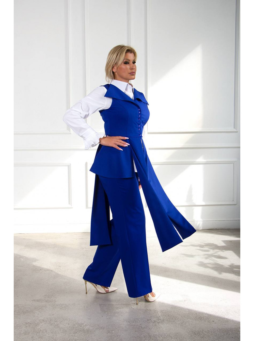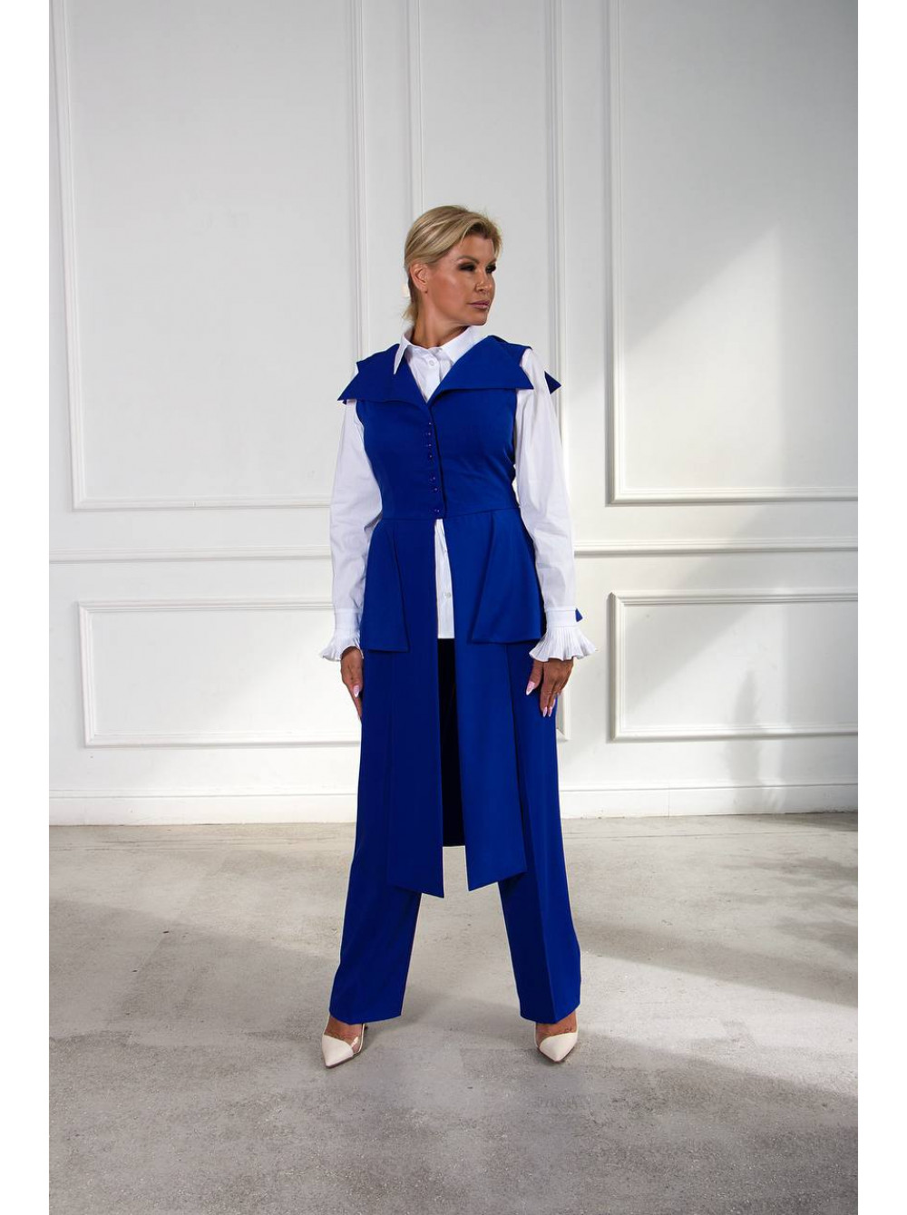 тот роскошный жилет — воплощение современной элегантности и смелого дизайна. Выполнен из плотной, структурированной ткани насыщенного королевского синего цвета, он идеально подчеркивает фигуру и создает впечатляющий образ.
