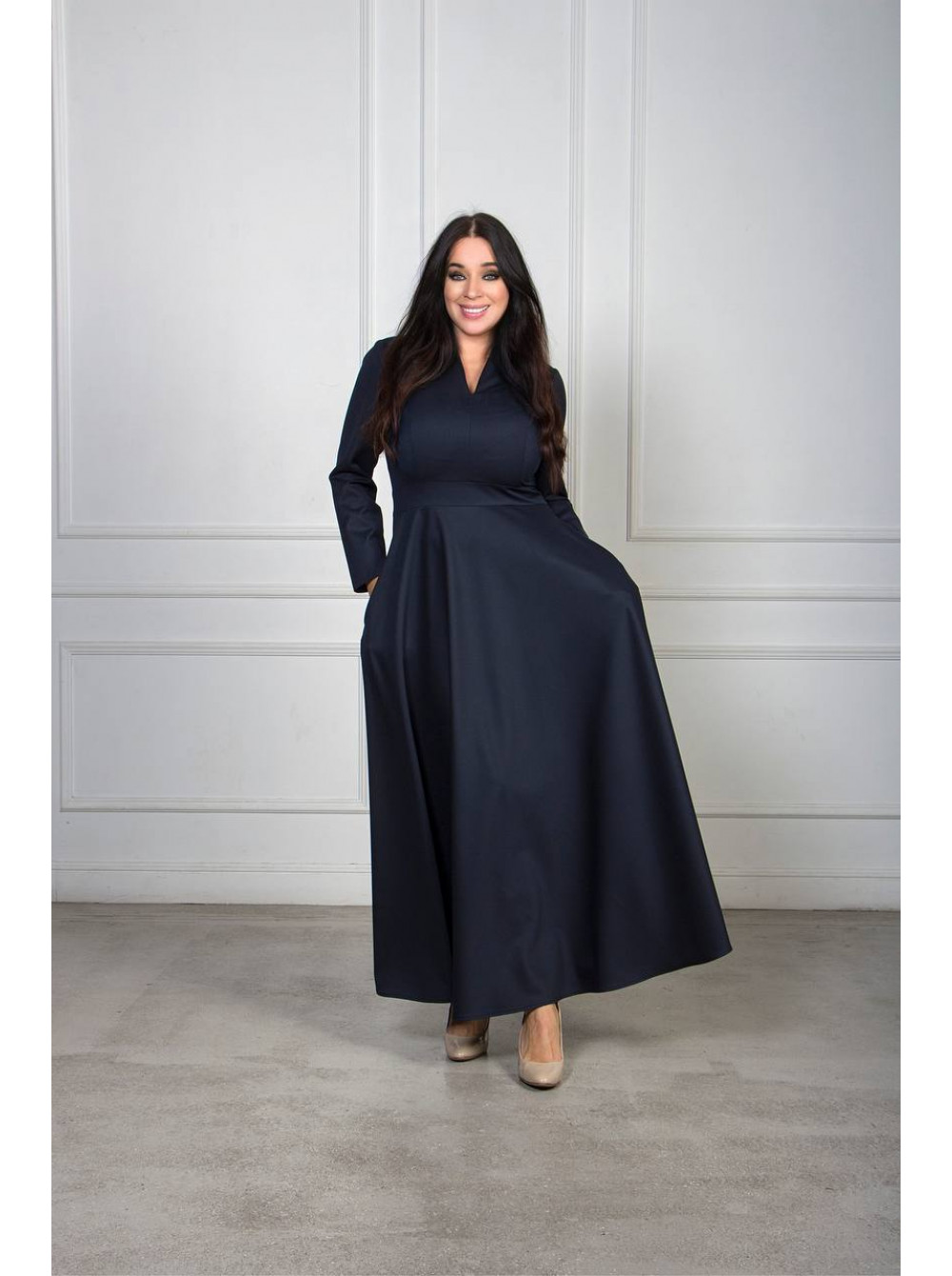 Модель представляет собой длинное платье с приталенным лифом и глубоким V-образным вырезом, который акцентирует внимание на линии декольте и шее. Длинные рукава добавляют образу строгости и элегантности, а широкий пояс на талии визуально удлиняет ноги и создает идеальные пропорции. Юбка А-силуэта плавно расширяется книзу, струясь при движении и придавая образу грациозность и воздушность.