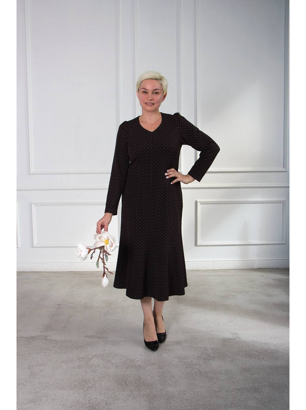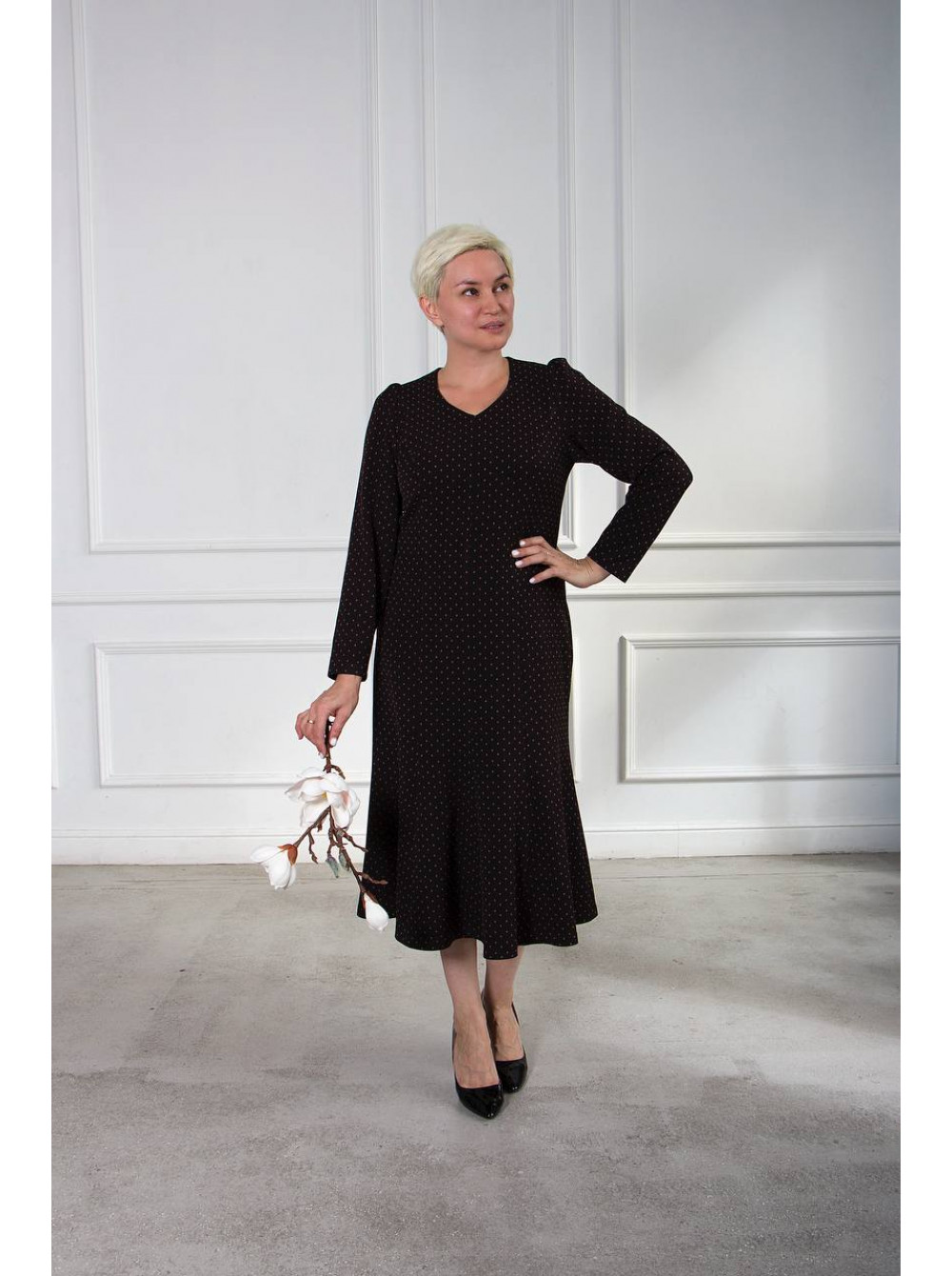 Крой: Приталенный силуэт с расклешённой юбкой миди-длины (до середины икры). Такой крой подчеркивает талию, акцентирует бёдра и визуально удлиняет ноги. Юбка свободно развевается при ходьбе — создавая эффект лёгкости и грации.