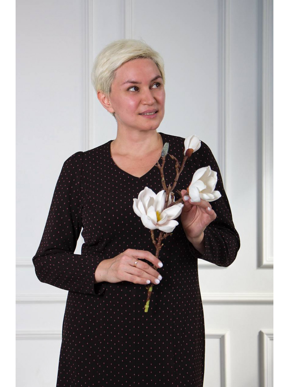 Цвет: Темно-коричневый фон с мелким красным горошком — символ нежности, игривости и женственности. Он подчеркивает кожу, добавляет образу загадочности и шика, не перегружая его. Идеален для весны и лета, но также прекрасно смотрится осенью в сочетании с золотыми аксессуарами.