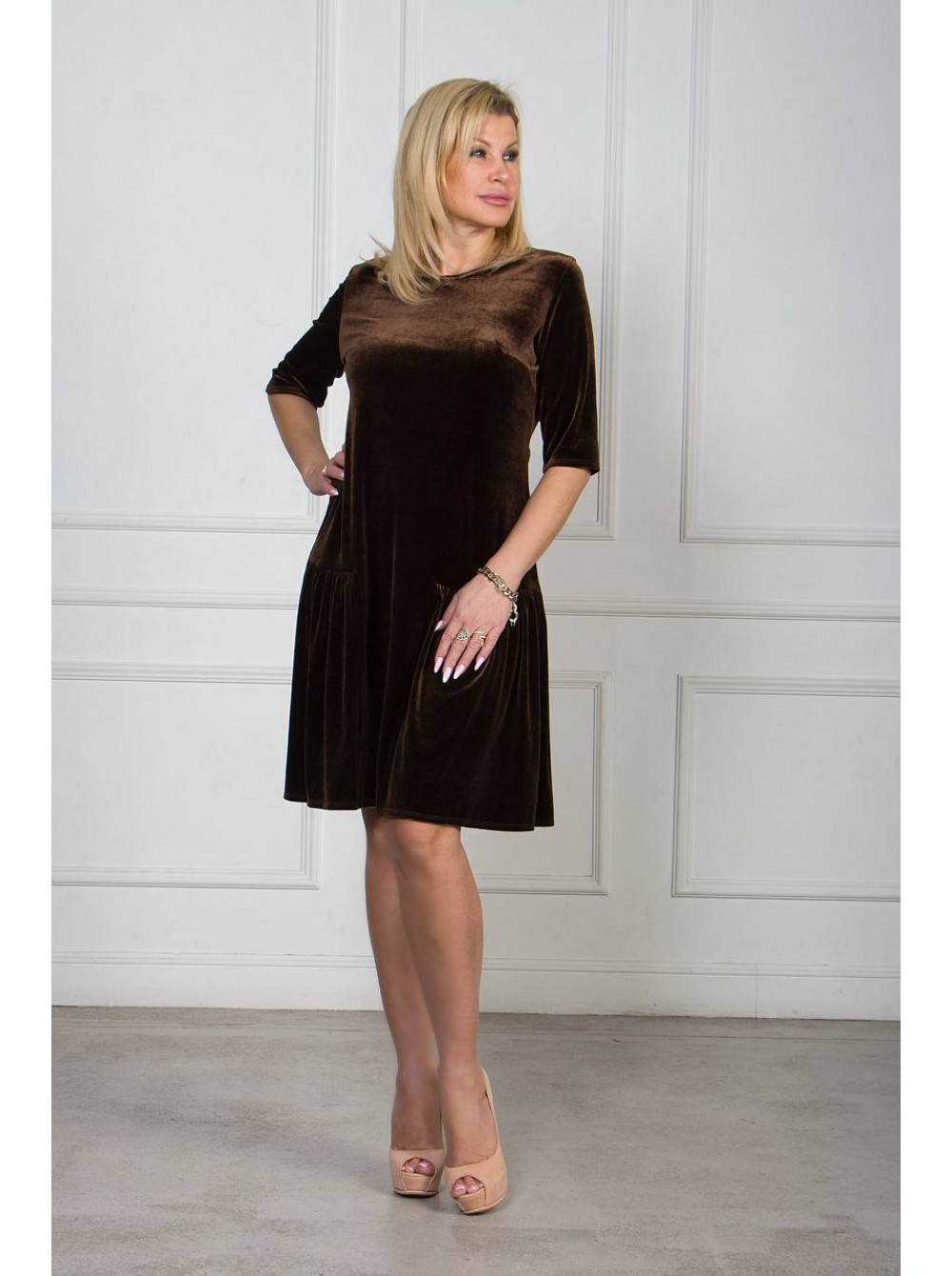 Роскошное платье из мягкого бархата глубокого шоколадного оттенка. Идеальный выбор для особых случаев и праздничных мероприятий.