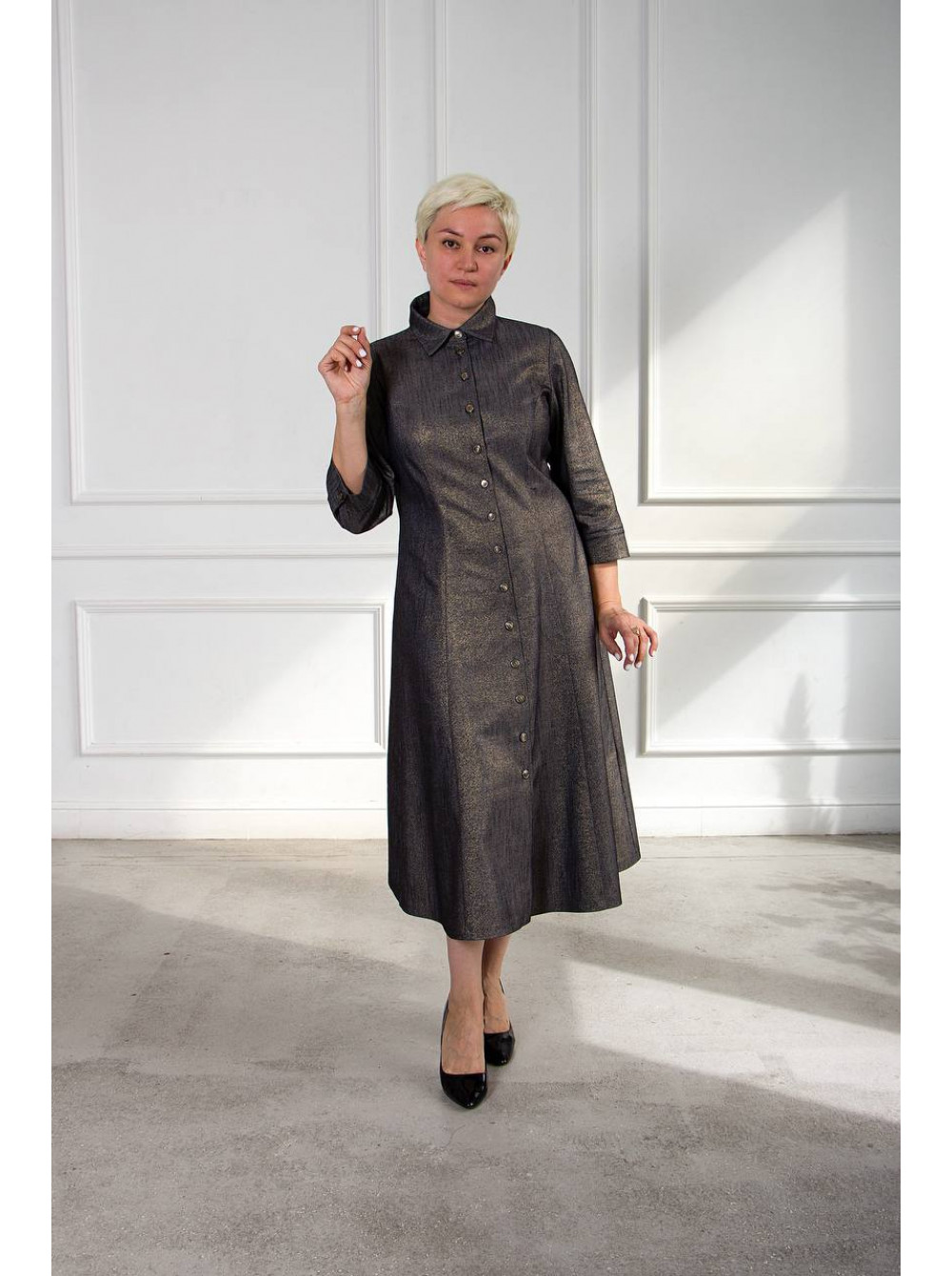 Застёжка: Центральная застежка на пуговицы — от горловины до низа юбки. Пуговицы выполнены в тон ткани, что создаёт цельный и гармоничный вид.